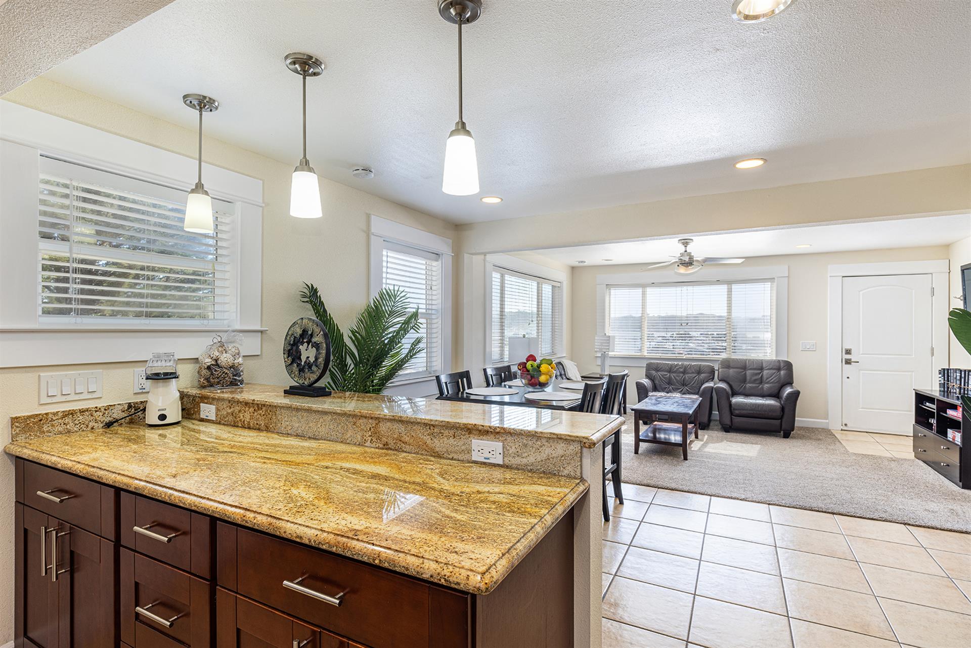 Kitchen has all the appliances you would need or use. Wonderful deck to sit on and watch the sunset over the Bay, or have a nice grilled dinner. Cherry cabinets, granite counter top with wonderful eating bar and stools. Queen size beds in each bedroom plus a queen aero bed. Sit and watch the birds dine or the sea lions play. Hike along the cliffs off Bodega Head and catch a glimpse of the migrating whales Nov.-April. If you like Golf try our PGA Certified Bodega Harbor Links Golf Course.